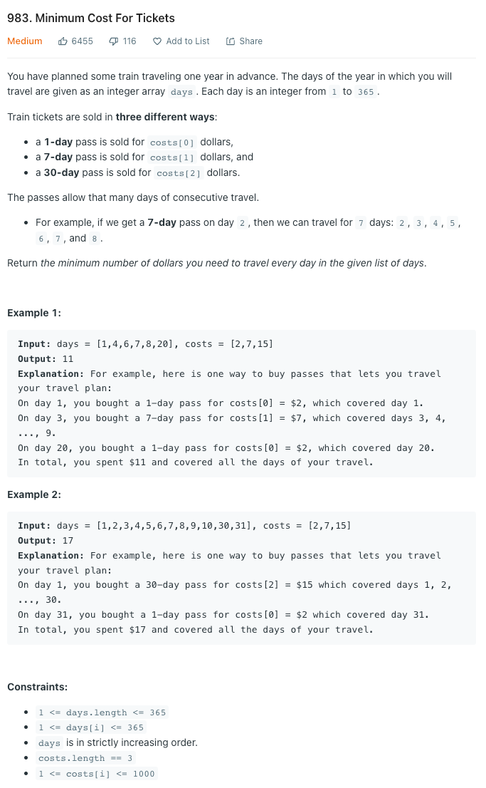 이때 주어진 days를 모두 여행할 수 있는 최소 pass 가격을 구하면 되는 문제다.