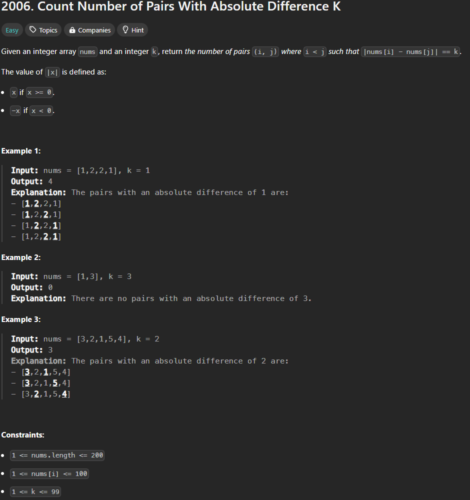 [Leetcode]2006. Count Number of Pairs With Absolute Difference K 본문