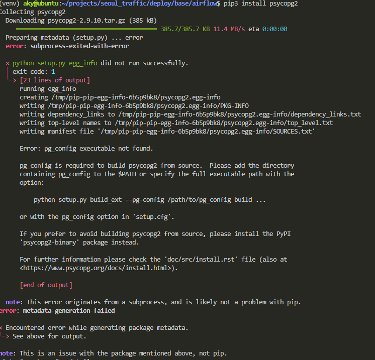 python 에서 postgresql을 사용하기 위해 패키지 설치 중 발생한 에러다.